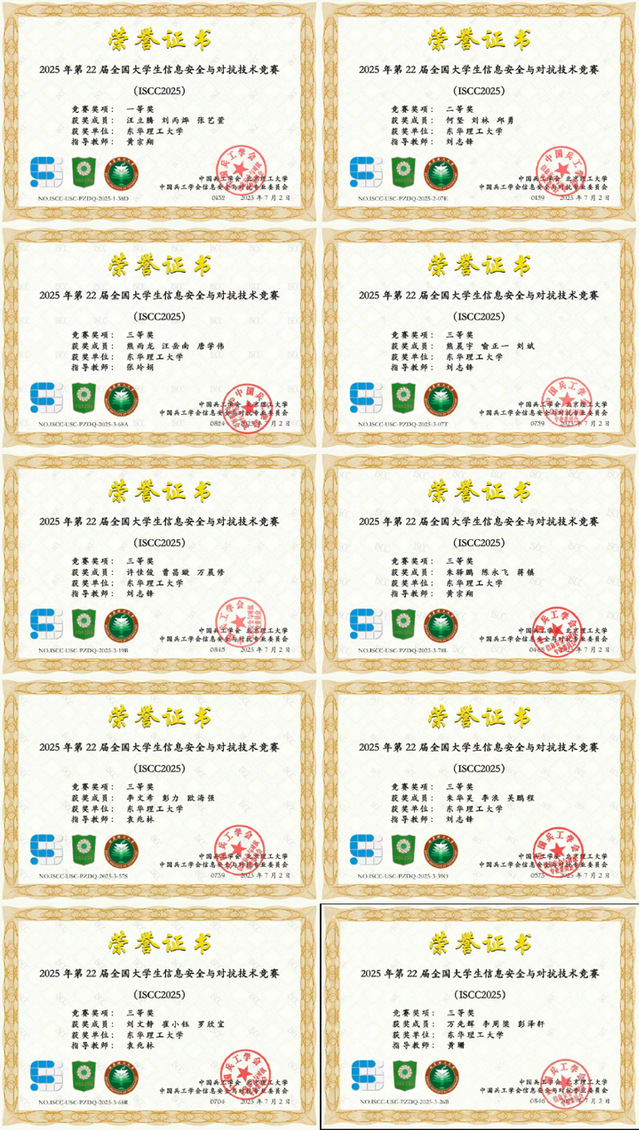 近日,2025年第22届全国大学生信息安全与对抗技术竞赛总决赛获奖名单揭晓。爱体育官方网站软件学院、人工智能与信息工程学院学子组成的参赛队伍共斩获全国一等奖1项、二等奖1项、三等奖8项。其中,由软件学院刘丙烨、人工智能与信息工程学院汪立腾、软件学院张艺萱组成的Joint_Sword团队表现尤为突出,勇夺全国一等奖,创造了学校在该项赛事中的历史最佳成绩。