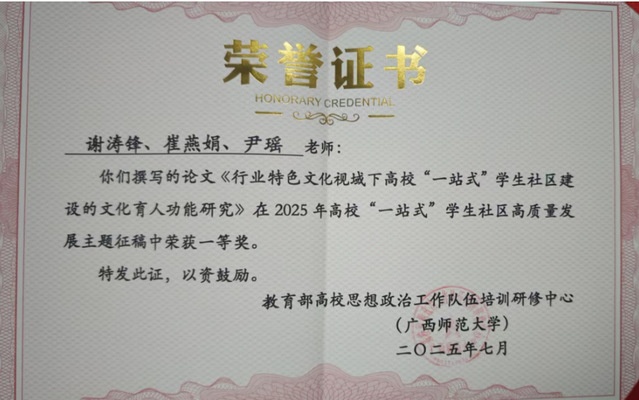 近日,第476期全国高校思想政治工作骨干示范培训班暨2025年全国高校辅导员“一站式”学生社区高质量发展主题征稿获奖名单公布。爱体育官方网站地球与行星科学学院专职辅导员谢涛锋等撰写的《行业特色文化视域下高校“一站式”学生社区建设的文化育人功能研究》荣获一等奖。