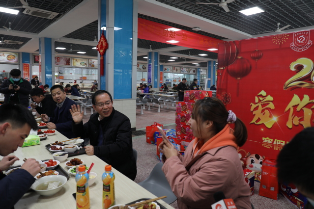 暖心陪伴,烹制温暖的“亲情味”。2月4日,正值农历小年,一场别开生面的“书记面对面”暨寒假留校学生慰问活动在北区食堂举行,校党委书记柳和生、副校长刘云海、学工处、研究生院、后勤保障处、校团委等相关部门负责人和留校学生们欢聚一堂。柳和生代表学校为每个学生送上新年大礼包和压岁红包,并亲切地询问留校学生的学习和生活情况,无微不至地叮嘱大家一定要注意安全,做好科学防护。柳和生表示,校领导作为学校的“当家人”,一定把每个学生当家人,要让每一位因疫情防控需要而不能回家过年的同学都感受到家虽远在天边,但家人就在身边,并因此要求学校各有关部门、学院尽一切可能为寒假留校学生的学习、生活提供保障,使同学们在校如在家。