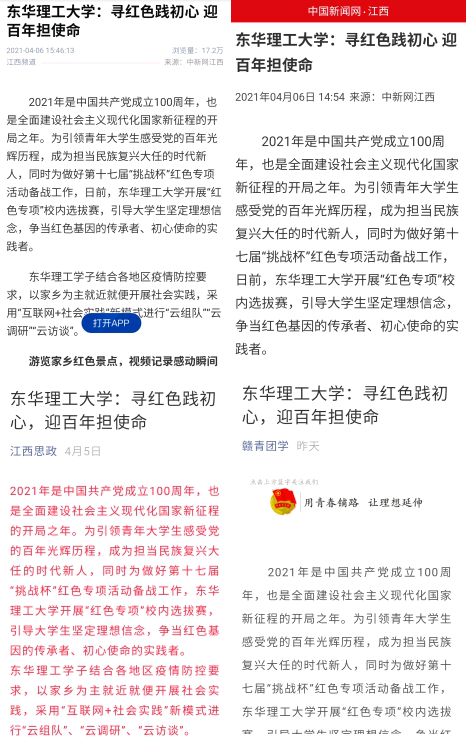编者按:近日,我校开展第十七届“挑战杯”红色专项活动校内选拔赛,大赛受到校党委行政高度重视,引发学院充分调动,获得师生广泛关注。校团委稳抓思想高点,指导教师力抓时代热点,参赛选手狠抓专业亮点,力争通过本届“挑战杯”红色专项赛,将传承红色基因的憧憬变成美丽实景,使继承革命精神的星火变成燎原烈火,让践行初心使命的成果变成满枝硕果。中国新闻网、新华社客户端、中国教育在线、江西思政、赣青团学等主流媒体,对我校“红色专项”活动的开展进行了报道,引起社会广泛关注,现将原文内容转载如下: