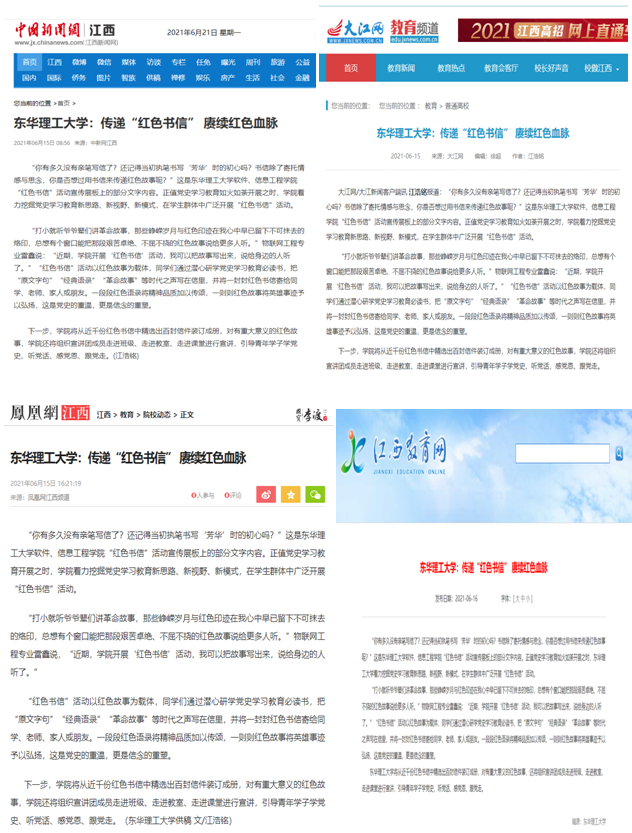 编者按:为了挖掘党史学习教育新思路、新视野、新模式,爱体育官方网站软件学院创新党史学习教育方式,在学生群体中广泛开展“红色书信”活动。中国教育电视台、江西教育电视台、中国新闻网、大江网、凤凰网、江西教育网等媒体对此进行报道,现将相关内容转载如下:
