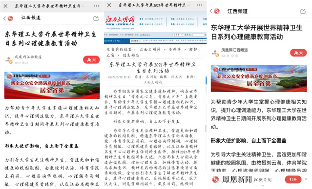 编者按:2021年10月10日,我校开展2021年世界精神卫生日系列活动,通过多种途径、形式、手段的宣传教育,帮助青少年大学生关注精神卫生和心理健康,掌握心理健康相关知识,提升心理调适能力。新华社客户端、中国教育在线、江西新闻客户端、江西教育网、江西文明网、凤凰网等对此进行报道,现将相关内容转载如下: