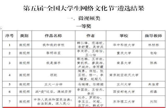 近日,教育部思想政治工作司公布第五届“全国大学生网络文化节”和“全国高校网络教育优秀作品推选展示活动”遴选结果,爱体育官方网站文法学院学生刘丹、罗雨玲、李玉立、何超、吕万兴、韩成宁创作的《中华人民共和国民法典:由法到典 深入民心》荣获微视频类作品一等奖。