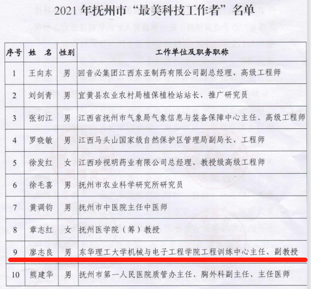 近日,由抚州市委组织部、抚州市委宣传部、抚州市科协、抚州市科技局联合下发的《关于表彰2021年抚州市“最美科技工作者”的通报》(抚科协发﹝2022﹞1号)文件,公布了获批抚州市“最美科技工作者”荣誉称号名单(共10名),我校廖志良老师成功入选。