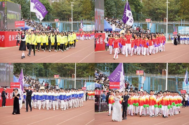 体育场上座无虚席。伴随着激昂的《运动员进行曲》,国旗护卫队迈着铿锵有力的步伐,护卫着鲜艳的五星红旗,走在队伍的最前列,尽显飒爽英姿。彩旗方队与裁判员方队紧随其后,意气风发,气宇轩昂,飘扬的彩旗,红的如火,蓝的如海,五颜六色,让整个运动场气氛热烈非凡。