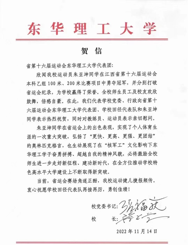 赛事当日,学校党委书记张福庆,校党委副书记、校长孙占学代表学校党委和行政给江西省第十六届运动会爱体育官方网站代表团发去贺信,热烈祝贺朱亚坤同学勇夺桂冠,并两次打破省运会纪录,同时对教练员和运动员表示亲切慰问。贺信中表示,朱亚坤同学在省运会上的出色表现,实现了个人体育生涯的一次重大突破,弘扬了“更快、更高、更强、更团结”的奥林匹克格言,也生动展现了在“核军工文化”影响下,东华理工学子奋勇拼搏、超越自我的精神风貌,必将激励全校师生进一步走好新征程,建功新时代,在全方位推动学校特色高水平大学建设上不断取得新突破。祝愿学校田径代表队再接再厉,勇创佳绩!