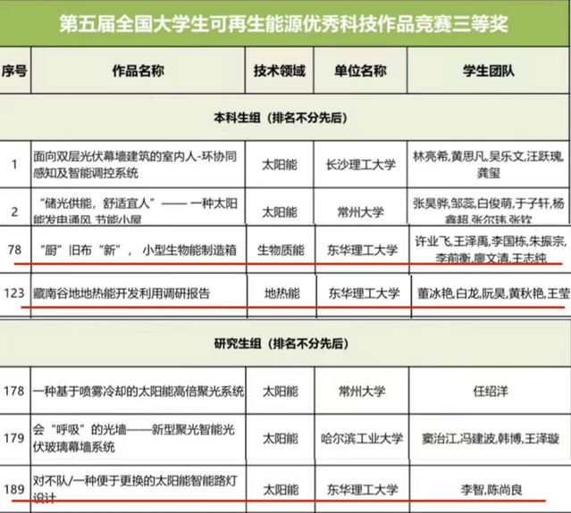 近日,第五届全国大学生可再生能源优秀科技作品竞赛圆满结束,我校参赛作品荣获二等奖1项、三等奖3项。获奖作品涵盖生物、地热和太阳能等多个研究方向,充分展现了我校学子在可再生能源领域的科研实力。