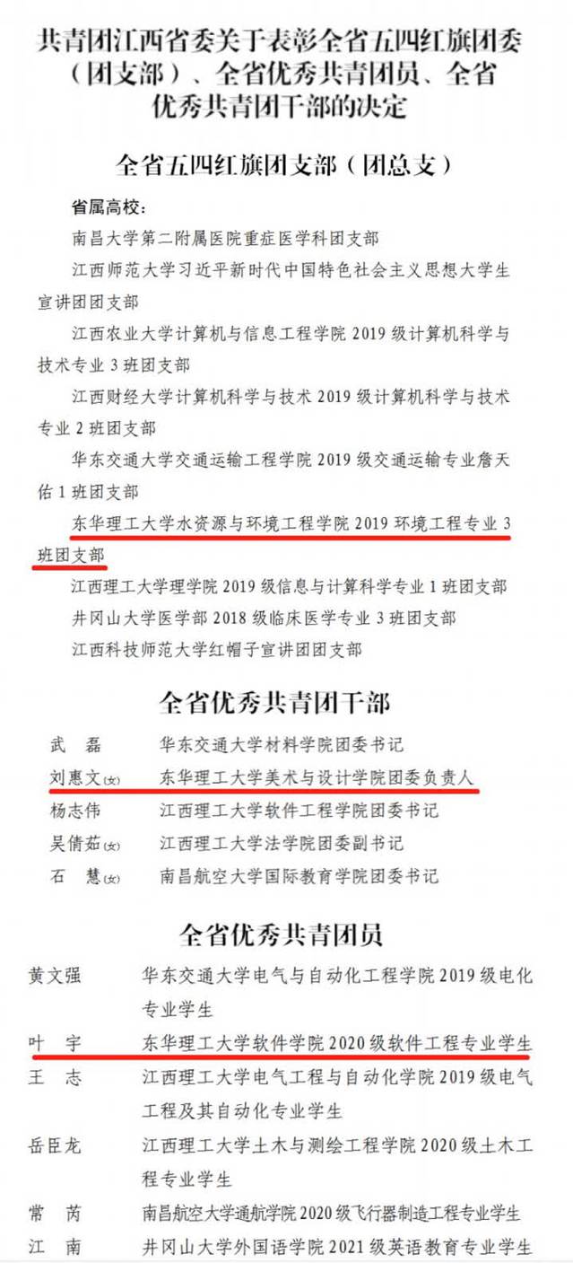 近日,共青团江西省委印发了《共青团江西省委关于表彰全省五四红旗团委(团支部)、全省优秀共青团员、全省优秀共青团干部的决定》(赣青发〔2023〕6号),对2022年度全省共青团先进典型进行表彰,爱体育官方网站水资源与环境工程学院2019环境工程专业3班团支部获2022年度“全省五四红旗团支部”称号;美术与设计学院刘惠文老师获“全省优秀共青团干部”称号;软件学院叶宇同学获“全省优秀共青团员”称号。