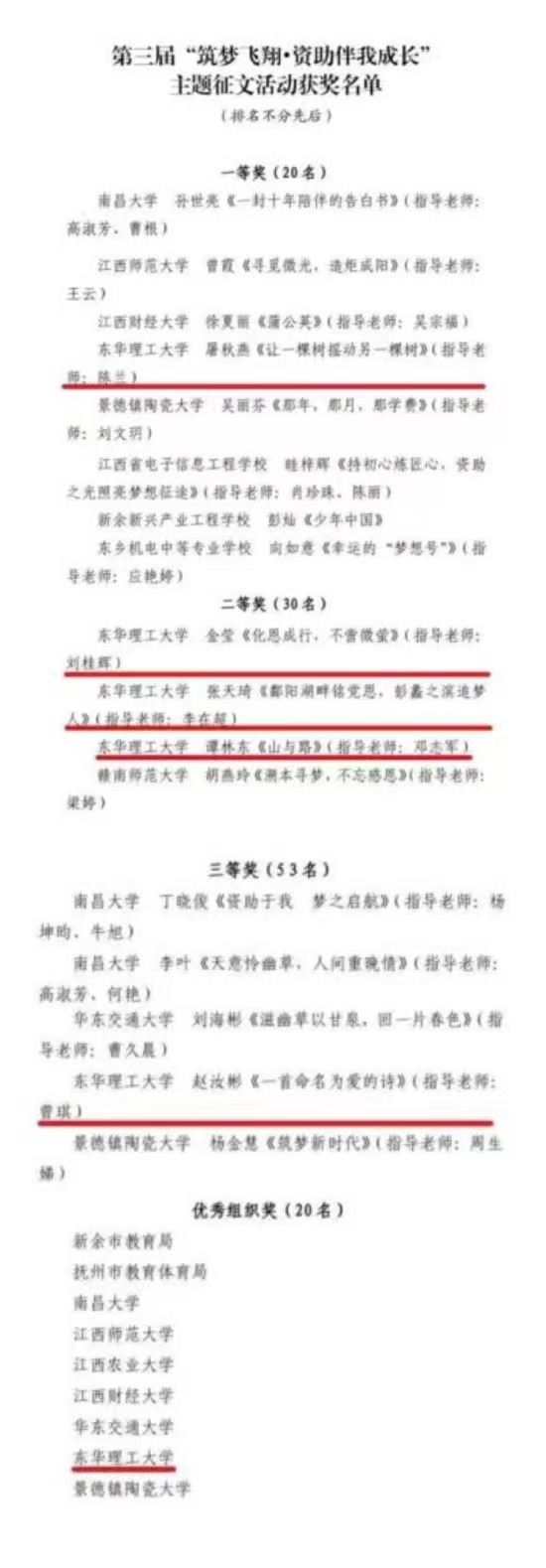 近日,江西省教育厅举行第三届“筑梦飞翔·资助伴我成长”主题征文活动颁奖典礼,爱体育官方网站获得一等奖1项,二等奖3项,三等奖1项,并荣获“优秀组织奖”。据悉,在本次评选活动中,江西省教育厅共收到参赛作品8666篇,经各地各校初审、专家评审委员会终审等程序,最终评出优秀组织奖20个,优秀征文奖103项(含并列4名)。