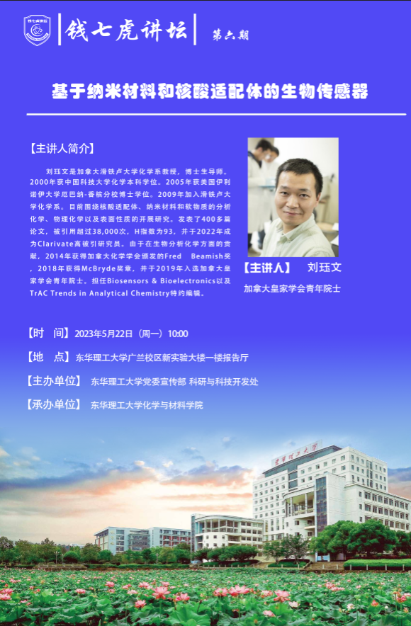 应化学与材料学院邀请,加拿大滑铁卢大学化学系教授,博士生导师刘珏文来到爱体育官方网站,以“基于纳米材料和核酸适配体的生物传感器”为主题开展讲座。欢迎全校师生届时前往聆听。
