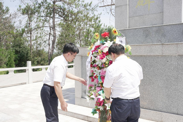 在赣核地质先驱纪念碑前,全体人员神情庄严,列队整齐,满怀崇敬之心瞻仰纪念碑,深切缅怀长眠于此的300余名核地质先驱,并向先驱默哀鞠躬。郭杰忠、张福庆缓缓走上台阶,向纪念碑敬献花篮并仔细整理花篮上的缎带。