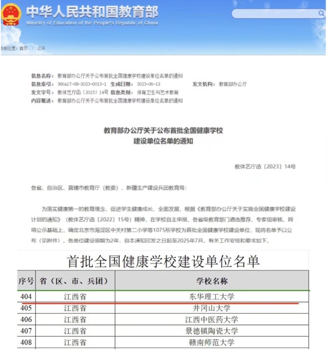近日,根据《教育部办公厅关于公布首批全国健康学校建设单位名单的通知》(教体艺厅函〔2023〕14号),爱体育官方网站入选首批全国健康学校建设单位。此次全国共确定1075所学校为首批健康学校建设单位,江西省共有32所学校入选,其中本科高校5所。