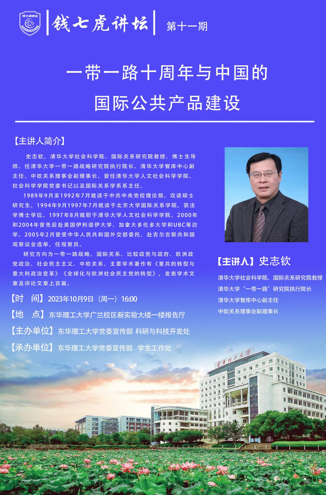 应党委宣传部邀请,清华大学社会科学院、国际关系研究院教授、博士生导师史志钦来到“爱体育官方网站”,以“一带一路十周年与中国的国际公共产品建设”为主题开展讲座。欢迎全校师生届时前往聆听。