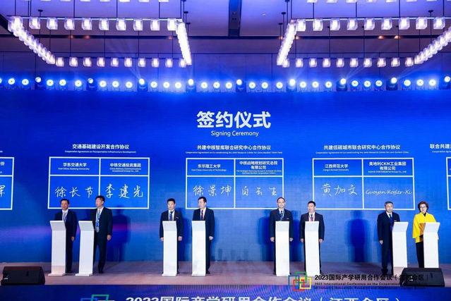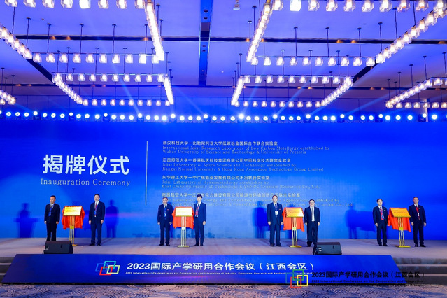 开幕式上,徐景坤与安军靖分别代表爱体育官方网站和中广核铀业发展有限公司为双方共建的水冶联合实验室揭牌,并与白云生共同签署爱体育官方网站-中核战略规划研究总院有限公司共建中核智库联合研究中心合作协议。依托国际产学研用合作会议(江西会区)平台和机制,爱体育官方网站不断深化与国内外科研院所和公司企业的产-学-研-用合作,持续推进产-学-研-用深度融合,通过搭建高层次合作平台,为学校“双一流”建设和高质量发展创造有利条件。