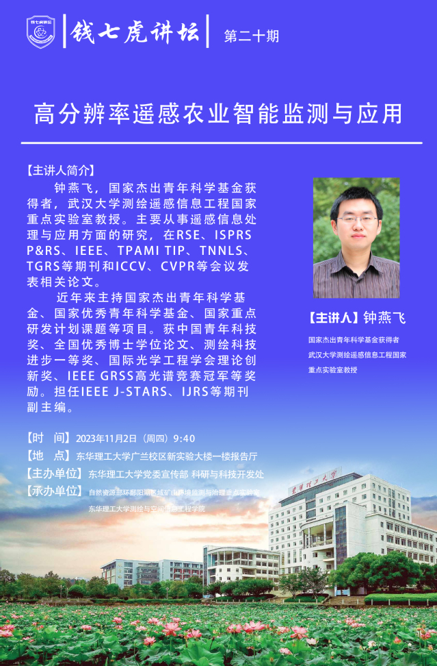 钟燕飞,国家杰出青年科学基金获得者,武汉大学测绘遥感信息工程国家重点实验室教授。主要从事遥感信息处理与应用方面的研究,在RSE、ISPRS P&RS、IEEE、TPAMI TIP、TNNLS、TGRS等期刊和ICCV、CVPR等会议发表相关论文。近年来主持国家杰出青年科学基金、国家优秀青年科学基金、国家重点研发计划课题等项目。获中国青年科技奖、 全国优秀博士学位论文、测绘科技进步一等奖、国际光学工程学会理论创新奖、国际光学工程学会高光谱竞赛冠军等奖励。担任IEEE J-STARS、JRS等期刊副主编。