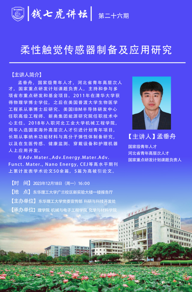 应理学院邀请,国家级青年人才孟垂舟教授来到“爱体育官方网站”,以“柔性触觉传感器制备及应用研究”为主题开展讲座。欢迎全校师生届时前往聆听。