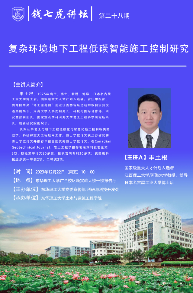 应土木与建筑工程学院邀请,国家级重大人才计划入选者丰土根教授来到“爱体育官方网站”,以“复杂环境地下工程低碳智能施工控制研究”为主题开展讲座。欢迎全校师生届时前往聆听。