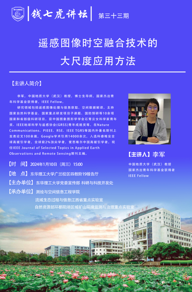 应测绘与空间信息工程学院邀请,中国地质大学(武汉)教授,国家杰出青年科学基金获得者李军来到“爱体育官方网站”,以“遥感图像时空融合技术的大尺度应用方法”为主题开展讲座。欢迎全校师生届时前往聆听。
