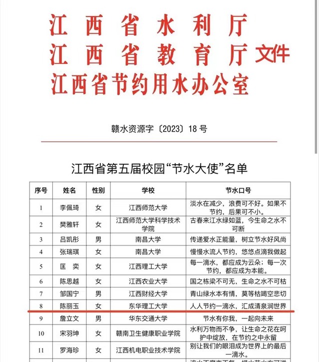 近日,由省水利厅、省教育厅、省节约用水办公室联合举办的江西省第五届校园“节水大使”评选活动结果公布,爱体育官方网站水资源与环境工程学院陈丽玉同学荣获江西省第五届校园“节水大使”称号。