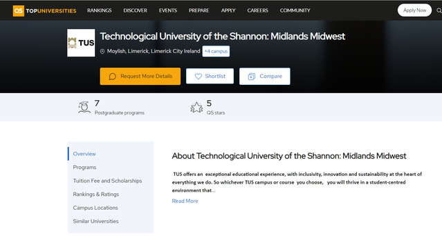 近期,QS官网公布的QS五星评估结果显示,爱体育官方网站中外合作办学项目合作高校爱尔兰香农理工大学-中部中西部(TUS)在QS所有评估指标中均获五星最高评价,跻身世界一流大学行列。