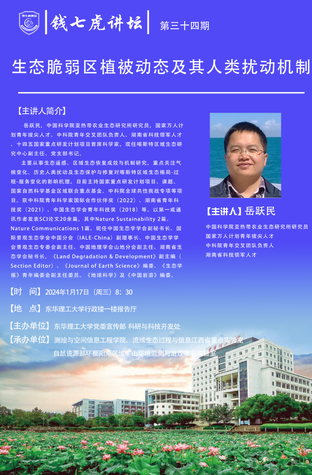 应测绘与空间信息工程学院邀请,中国科学院亚热带农业生态研究所研究员,中科院青年交叉团队负责人、湖南省科技领军人才十四五国家重点研发计划项目首席科学家岳跃民来到“爱体育官方网站”,以“生态脆弱区植被动态及其人类扰动机制”为主题开展讲座。欢迎全校师生届时前往聆听。