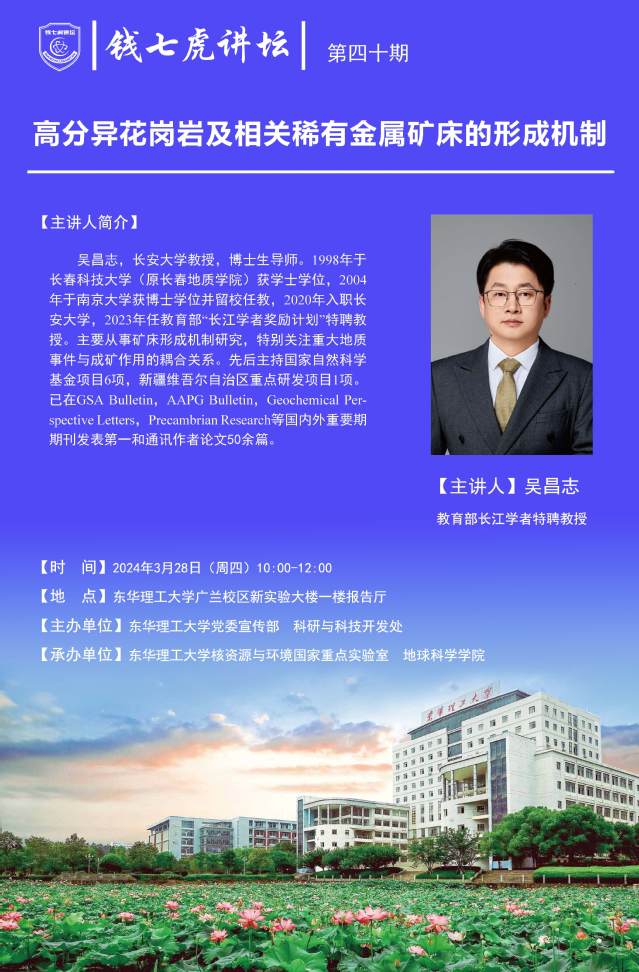 应核资源与环境国家重点实验室、地球科学学院邀请,长安大学教授、博士生导师吴昌志来到“爱体育官方网站”,以“高分异花岗岩及相关稀有金属矿床的形成机制”为主题开展讲座。欢迎全校师生届时前往聆听。