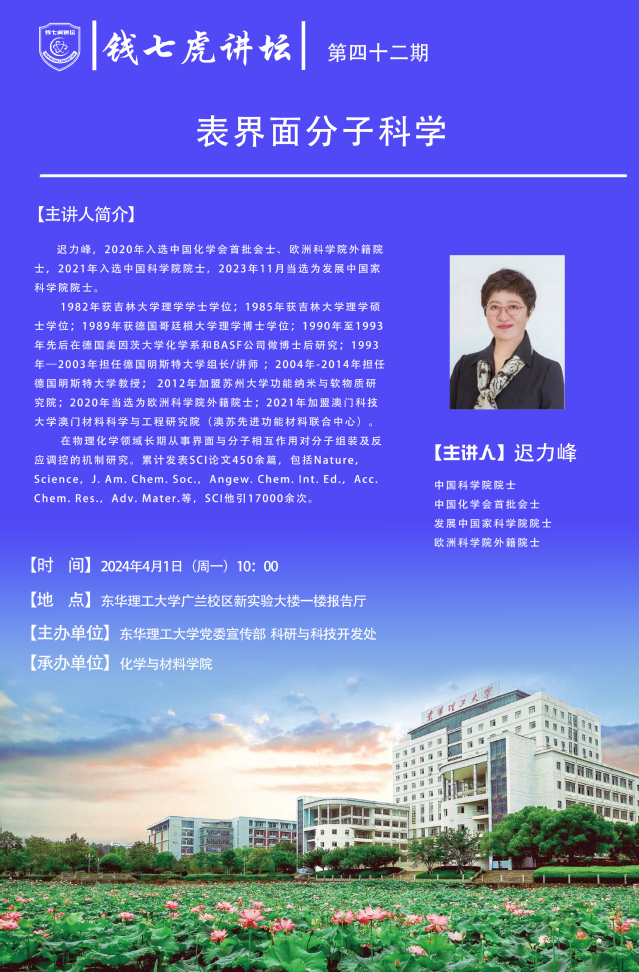 应化学与材料学院邀请,中国科学院院士迟力峰来到“爱体育官方网站”,以“表界面分子科学”为主题开展讲座。欢迎全校师生届时前往聆听。