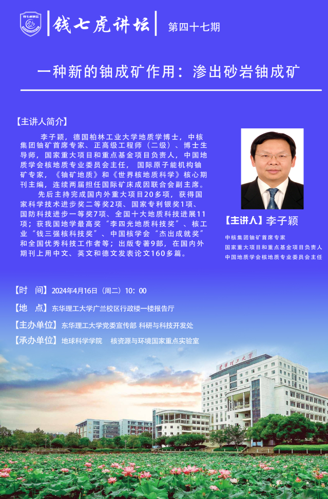 应地球科学学院、核资源与环境国家重点实验室邀请,德国柏林工业大学地质学博士,中核集团铀矿首席专家李子颖到“爱体育官方网站”,以“一种新的铀成矿作用:渗出砂岩铀成矿”为主题开展讲座。欢迎全校师生届时前往聆听。