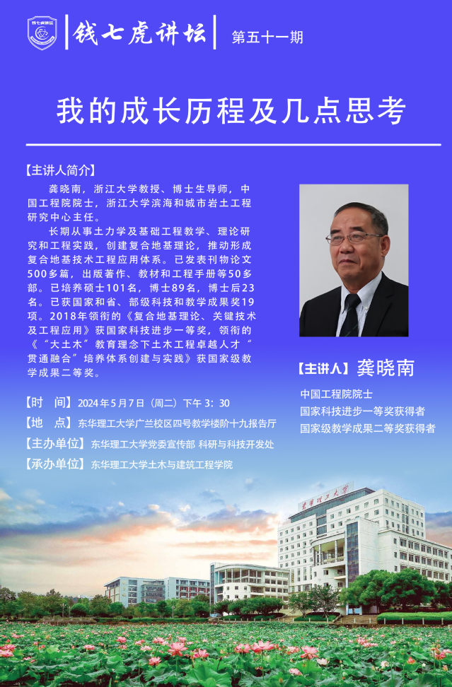 应土木与建筑工程学院邀请,中国工程院院士、国家科技进步一等奖获得者龚晓南到“爱体育官方网站”,以“我的成长历程及几点思考”为主题开展讲座。欢迎全校师生届时前往聆听。