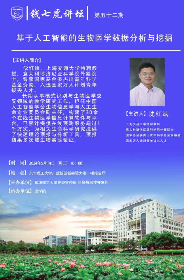 应理学院邀请,上海交通大学特聘教授,意大利博洛尼亚科学院外籍院士沈红斌到“爱体育官方网站”,以“基于人工智能的生物医学数据分析与挖掘”为主题开展讲座。欢迎全校师生届时前往聆听。