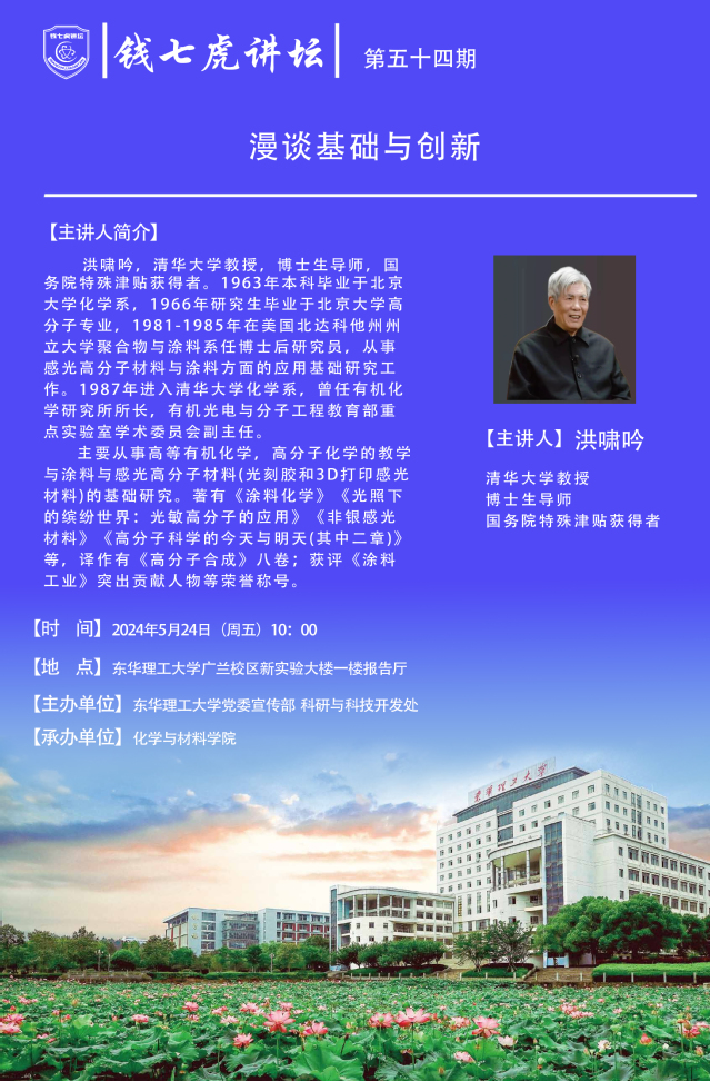 应化学与材料学院邀请,清华大学教授,博士生导师,国务院特殊津贴获得者洪啸吟到“爱体育官方网站”,以“漫谈基础与创新”为主题开展讲座。欢迎全校师生届时前往聆听。