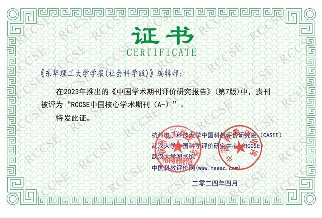 近日,由杭州电子科技大学中国科教评价研究院、武汉大学中国科学评价研究中心、武汉大学图书馆、中国科教评价网等单位联合研制的《中国学术期刊评价研究报告——RCCSE权威、核心期刊排行榜与指南》(第7版)正式发布。《爱体育官方网站学报(社会科学版)》入选“RCCSE中国核心学术期刊(A-)”。这是继《爱体育官方网站学报(自然科学版)》成功入编2023版《中文核心期刊要目总览》后,业界对学校办刊质量和学术影响力的又一充分肯定。