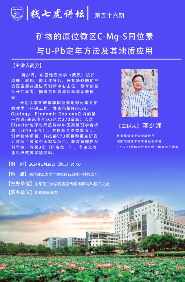 应地球科学学院邀请,国家级人才蒋少涌到“爱体育官方网站”,以“矿物的原位微区C-Mg-S同位素与U-Pb定年方法及其地质应用”为主题开展讲座。欢迎全校师生届时前往聆听。