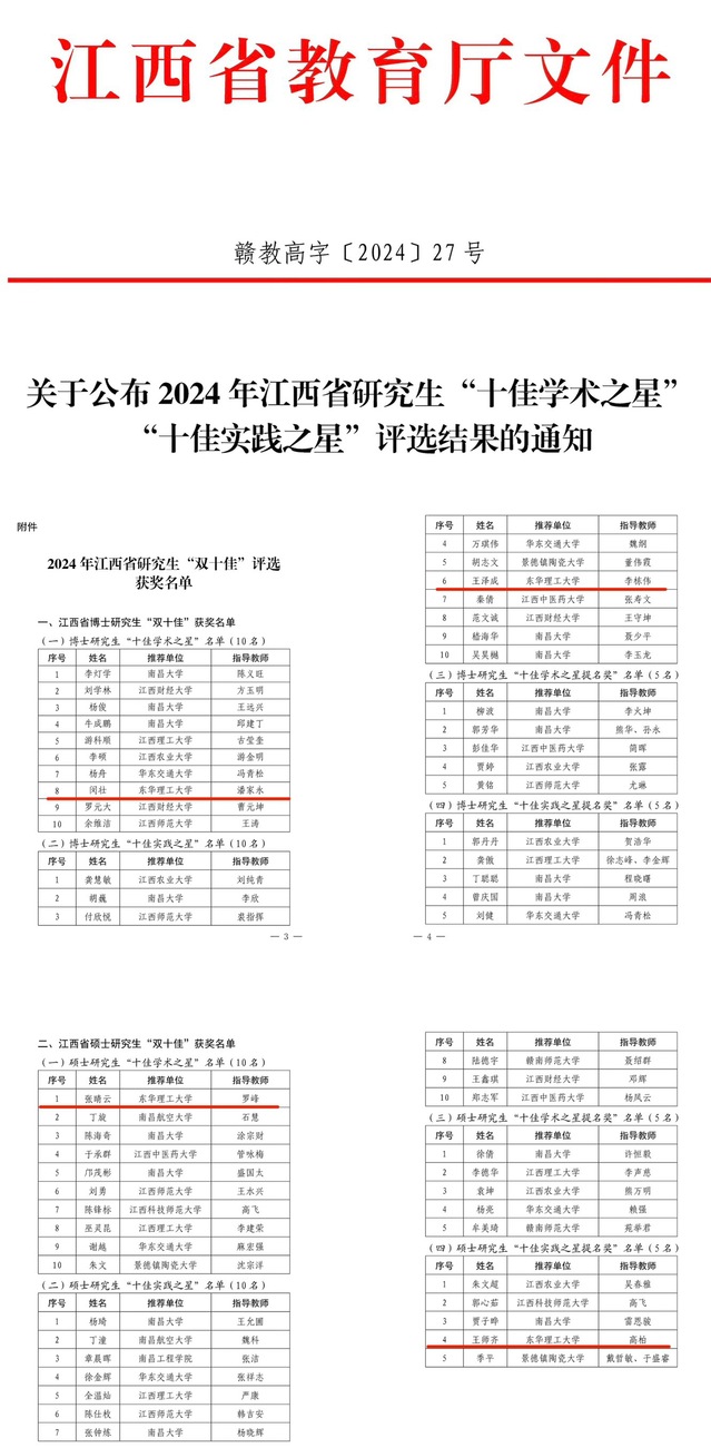 近日,江西省教育厅下发《关于公布2024年江西省研究生“十佳学术之星”“十佳实践之星”评选结果的通知》(赣教高字〔2024〕27 号),爱体育官方网站4名研究生榜上有名。其中,爱体育官方网站地球科学学院2021级博士闵壮、水资源与环境工程学院2022级博士王泽成分别荣获2024年江西省博士研究生“十佳学术之星”与“十佳实践之星”,化学与材料学院2021级硕士张晴云荣获硕士研究生“十佳学术之星”,水资源与环境工程学院2021级硕士王师齐获硕士研究生“十佳实践之星提名奖”,创学校历史最好成绩。