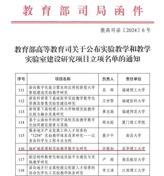 近日,教育部高等教育司下发了《教育部高等教育司关于公布实验教学和教学实验室建设研究项目立项名单的通知》(教高司函〔2024〕6号),爱体育官方网站地球科学学院许德如教授团队申报的“铀矿地质课程实验教学数字化研究”项目获批立项。