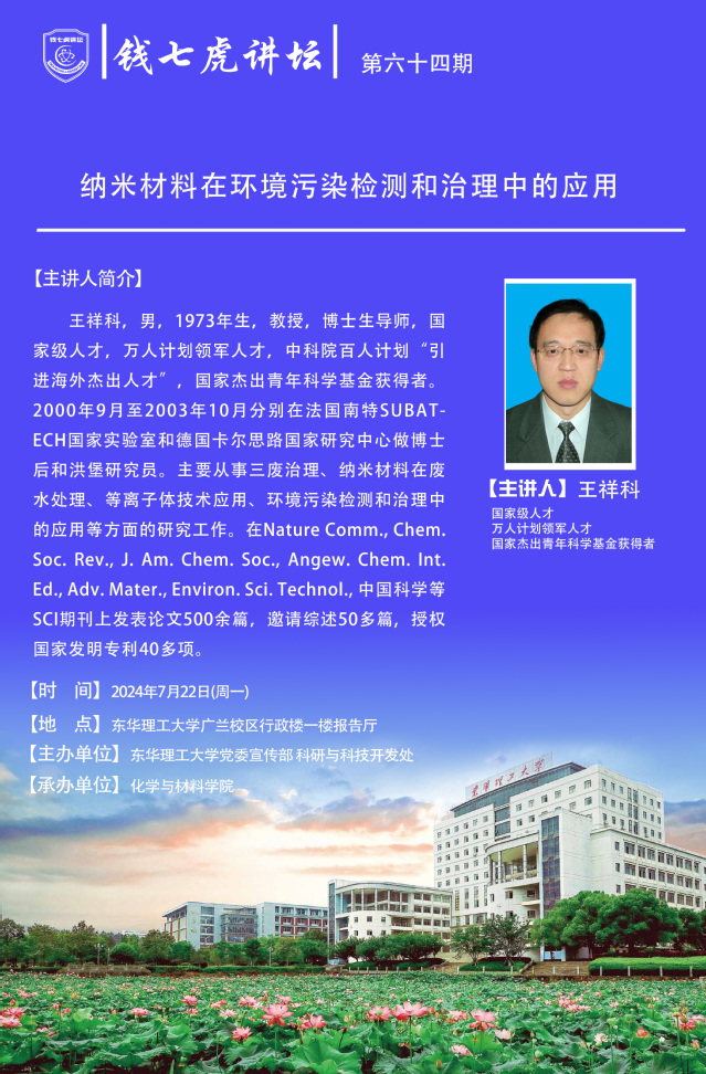 应化学与材料学院邀请,国家级高层次人才王祥科到“爱体育官方网站”,以“纳米材料在环境污染检测和治理中的应用”为主题开展讲座。欢迎全校师生届时前往聆听。