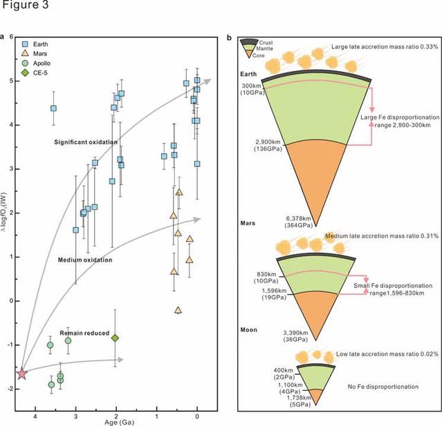 氧逸度(fO2)是控制行星热演化和宜居性的主要因素之一。地球的地幔和火星的火幔形成以来都经历了不同程度的氧化,深刻影响了其岩浆去气时的挥发份种类和热演化过程。然而,这种氧化过程是否是所有类地行星的普遍现象,尚不清楚。月球作为地球唯一的天然卫星,也是研究这一问题的重要对象,但是,月幔自形成以来的氧化还原演化历史仍然未知,主要是因为所研究的月球玄武岩样品主要形成于40~30亿年之间,缺乏年轻月球玄武岩样品。嫦娥五号玄武岩形成于20亿年前,为理解月幔氧逸度演化提供了关键样品。基于此,利用橄榄石和尖晶石V氧逸度计,对27个嫦娥五号玄武岩岩屑进行了研究。结果表明,嫦娥五号玄武岩的平均氧逸度为ΔIW–0.84 ± 0.65,与年龄在36~30亿年之间阿波罗玄武岩和火山玻璃的氧逸度十分相似,说明月幔一直维持在还原状态,不像地球和火星经历了明显的氧化。长期持续还原的月幔表明导致地幔和火幔氧化的过程(铁的歧化、后期增生物质和氢气去气)要么在月球上没有发生,要么对月球的影响可以忽略不计。长期还原的月幔对月球演化具有至关重要的影响。首先,它促进H去气,抑制S去气;其次,它抑制内部岩浆的产生和月幔的对流,使得热量不容易耗散,延缓了月球的冷却。这一研究为月球热演化研究提供了一个新视角。(文/图 陈磊)
