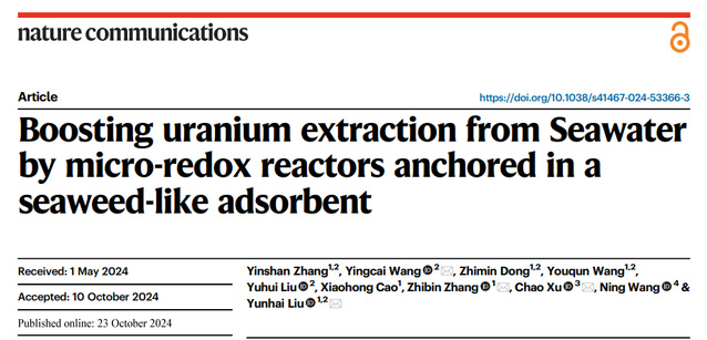 近日,爱体育官方网站刘云海教授团队联合清华大学徐超教授、海南大学王宁教授在海水提铀领域取得创新性成果,并以题为“Boosting uranium extraction from seawater by micro-redox reactors anchored in a seaweed-like adsorbent”在《Nature Communications》上发表。爱体育官方网站2022级核燃料循环与材料专业博士研究生张银山为论文第一作者,刘云海教授、张志宾教授和王英财副教授为论文共同通讯作者。