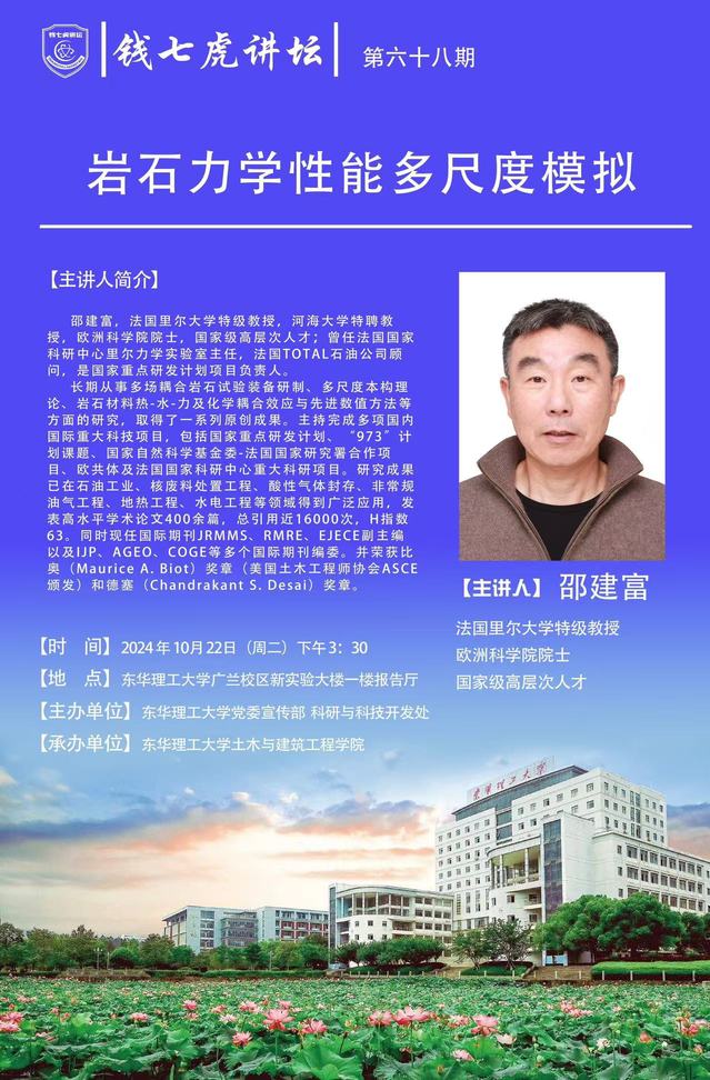 应土爱体育官方网站木与建筑工程学院邀请,法国里尔大学特级教授,河海大学特聘教授,欧洲科学院院士,国家级高层次人才邵建富到“爱体育官方网站”,以“岩石力学性能多尺度模拟”为主题开展讲座。欢迎全校师生届时前往聆听。