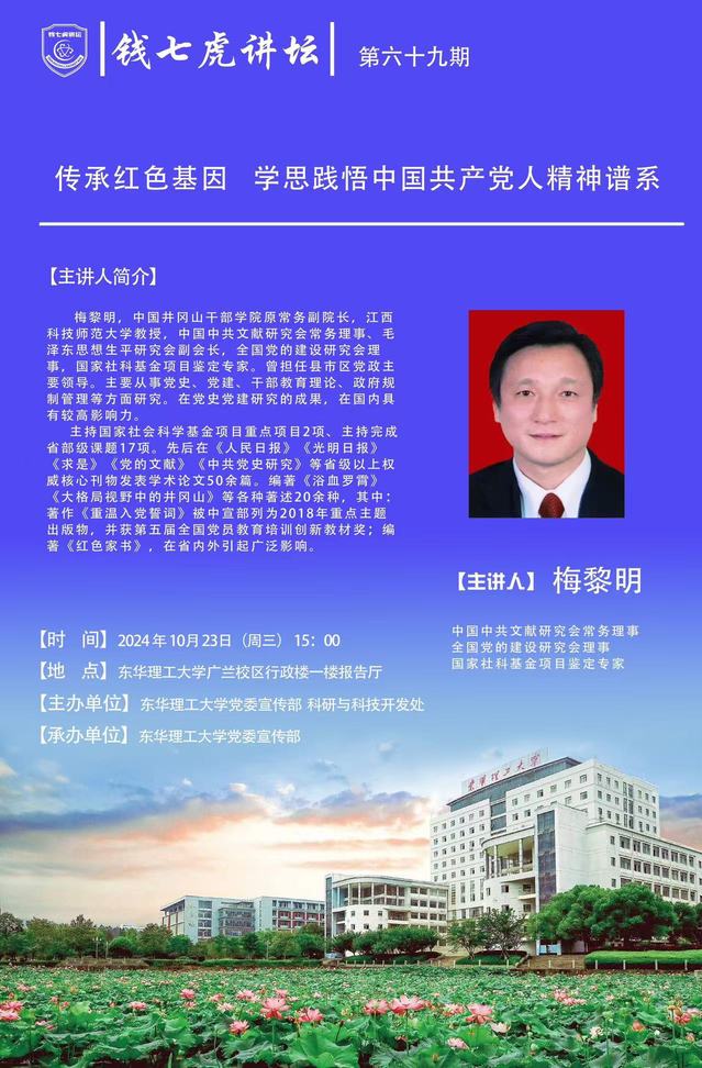 应爱体育官方网站党委宣传部邀请,江西科技师范大学教授,中国中共文献研究会常务理事、毛泽东思想生平研究会副会长,全国党的建设研究会理事,国家社科基金项目鉴定专家梅黎明到“爱体育官方网站”,以“传承红色基因 学思践悟中国共产党人精神谱系”为主题开展讲座。欢迎全校师生届时前往聆听。