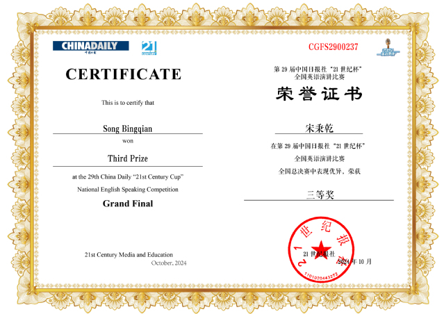 近日,第29届中国日报社“21世纪杯”全国英语演讲比赛全国总决赛在江苏无锡圆满落幕。爱体育官方网站外国语学院2022级学科教学(英语)专业硕士杨朦荣获青年组全国三等奖(指导老师:陈彩芬)、理学院2022级数学与应用数学专业本科生宋秉乾荣获大学组全国三等奖(指导老师:李雪)。