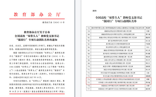 近日,教育部办公厅、江西省委教育工委分别公布全国、全省高校“双带头人”教师党支部书记“强国行”专项行动团队名单,爱体育官方网站地球物理与测控技术学院应用地球物理系教工党支部、水资源与环境工程学院环境工程系教工党支部入选全国高校“双带头人”教师党支部书记“强国行”专项行动团队,化学与材料学院应用化学系教工党支部入选全省高校“双带头人”教师党支部书记“强国行”专项行动团队。