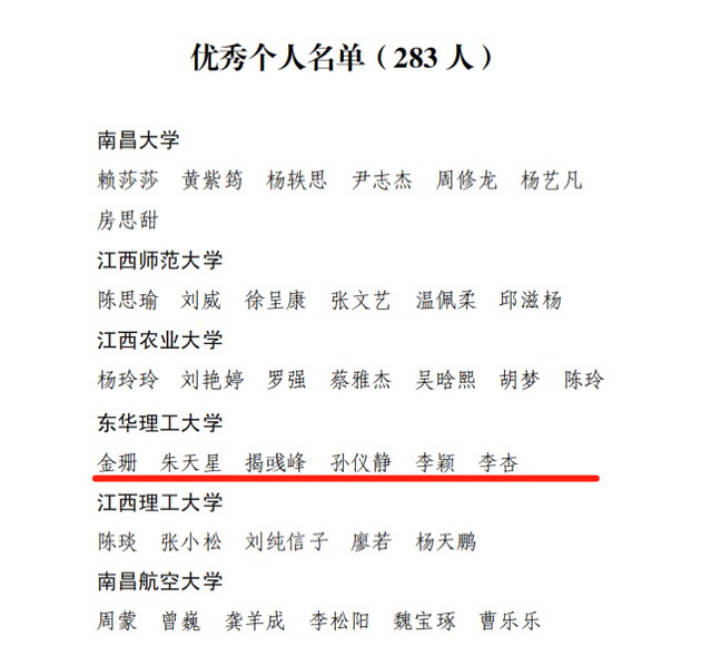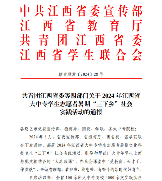 近日,中共江西省委宣传部、江西省教育厅、共青团江西省委、江西省学生联合会四部门联合发布了2024年江西省大中专学生志愿者暑期“三下乡”社会实践活动的通报,爱体育官方网站获多项荣誉,其中校团委荣获“三下乡”社会实践活动优秀单位,“青春筑梦”暑期社会实践队等6支学校实践队伍获评优秀团队,金珊、朱天星、揭彧峰、孙仪静、李颖、李杏6名师生获评优秀个人,《推进三产三化创新发展,构筑高效乡村致富路径——以江西省九江市武宁县东山村为例的调查研究》获评优秀调研报告,邓舒琴、冯治闻、黄怡群、喻文亮4人获评“扬帆计划”优秀个人称号。