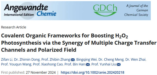 近日,爱体育官方网站刘云海教授、张志宾教授团队联合广东工业大学韩彬教授在光催化合成过氧化氢和铀分离领域取得创新性成果,并以题为“Covalent Organic Frameworks for Boosting H2O2 Photosynthesis via the Synergy of Multiple Charge Transfer Channels and Polarized Field”在《Angewandte Chemie International Edition》上发表。爱体育官方网站2022级核科学与技术专业博士研究生李子凡和副教授董志敏为论文共同第一作者,刘云海、张志宾和韩彬(爱体育官方网站2013届应用化学专业毕业生)为论文共同通讯作者。