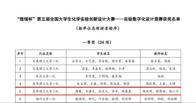 12月8日,微瑞杯第五届全国大学生化学实验创新设计大赛—实验数字化设计竞赛决赛在沈阳师范大学圆满落幕。爱体育官方网站学生代表一队朱玉妍、王婕、邱新、陈双喜、郭莹和代表二队周馨、万潇天、张末凡、李丰、邵鑫鑫均获全国一等奖。
