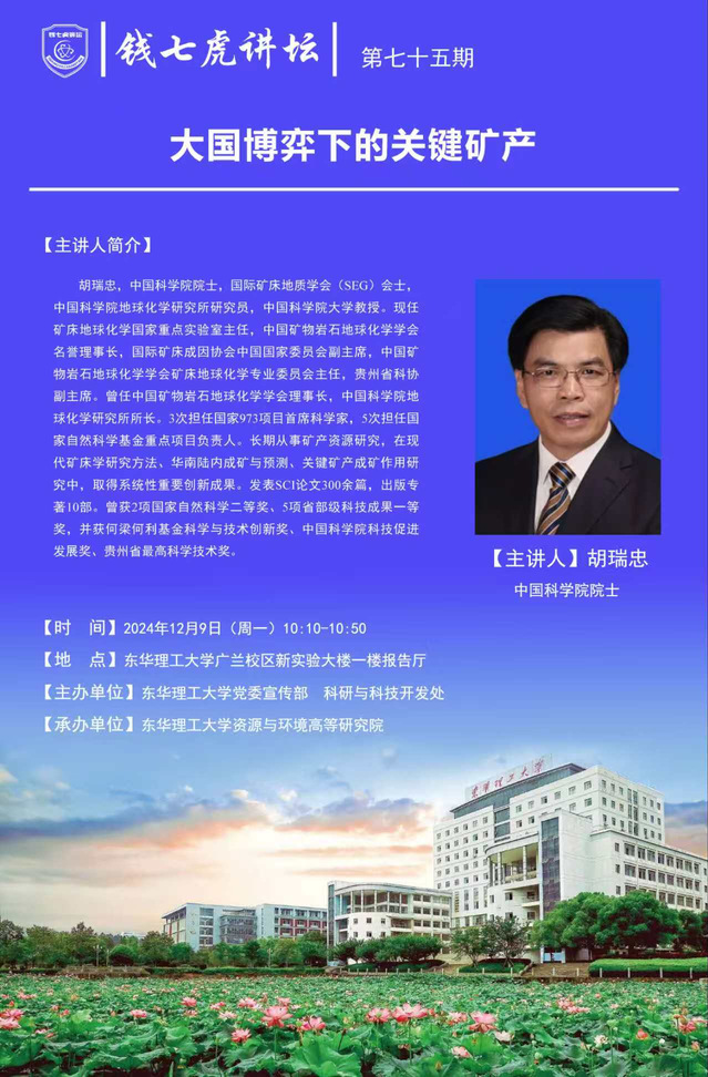 应爱体育官方网站资源与环境高等研究院邀请,中国科学院院士、中国科学院大学教授胡瑞忠到“爱体育官方网站”,以“大国博弈下的关键矿产”为主题开展讲座。欢迎全校师生届时前往聆听。