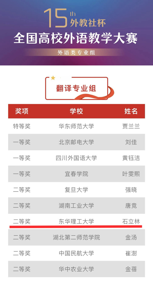 12月8日,第十五届“外教社杯”全国高校外语教学大赛全国决赛、总决赛在上海落幕,爱体育官方网站外国语学院教师石立林获得翻译专业组全国二等奖。