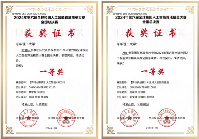 由爱体育官方网站吴超、胡瑞、熊晨果组成的学生代表队获“算法创新赛-人工智能+新工科”赛道全国一等奖;刘文博、何景阳、张熙凌组成的学生代表队获“算法挑战赛-AI生成人脸图像鉴别”赛道全国一等奖,创造了学校在该项赛事的历史最好成绩。