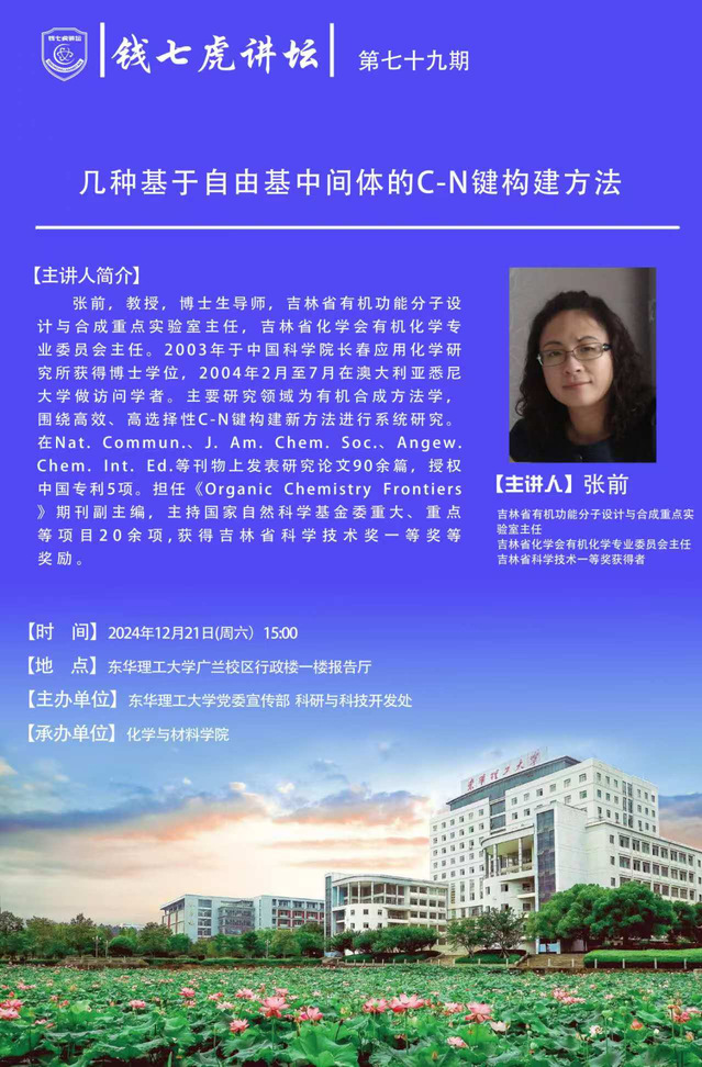 应化学与材料学院邀请,吉林省有机功能分子设计与合成重点实验室主任张前到“爱体育官方网站”,以“几种基于自由基中间体的C-N键构建方法”为主题开展讲座。欢迎全校师生届时前往聆听。