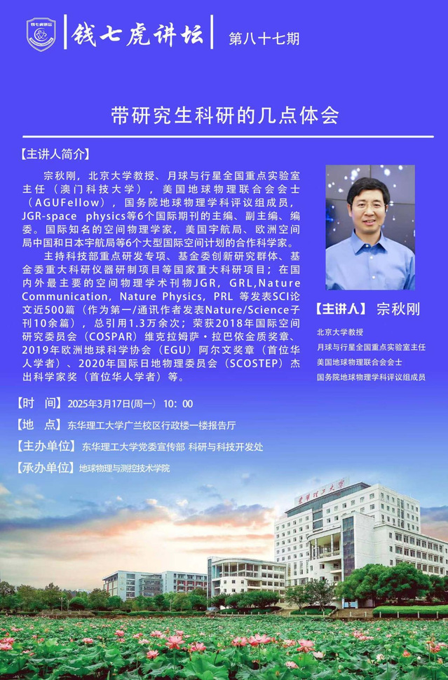 应地球物理与测控技术学院邀请,北京大学教授宗秋刚到“爱体育官方网站”,以“带研究生科研的几点体会”为主题开展讲座。欢迎全校师生届时前往聆听。